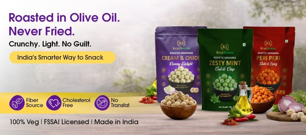 KratBroma offers premium roasted makhana made with olive oil, never fried. Enjoy a light, crunchy and guilt-free snack crafted for everyday healthy snacking.