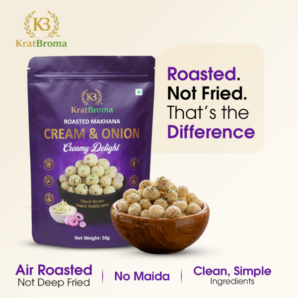 KratBroma Cream & Onion Roasted Makhana 50g | Creamy Delight Flavour | Roasted Not Fried Lotus Seeds Snack | Made with Olive Oil | Cholesterol Free & Trans Fat Free