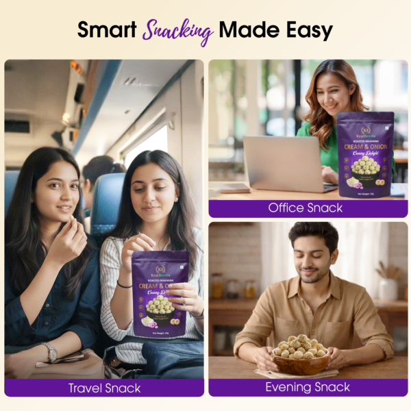 Enjoy a comforting classic with KratBroma Cream & Onion Roasted Makhana (50g) — a creamy delight made from premium lotus seeds and roasted, not fried for a light crunch.
