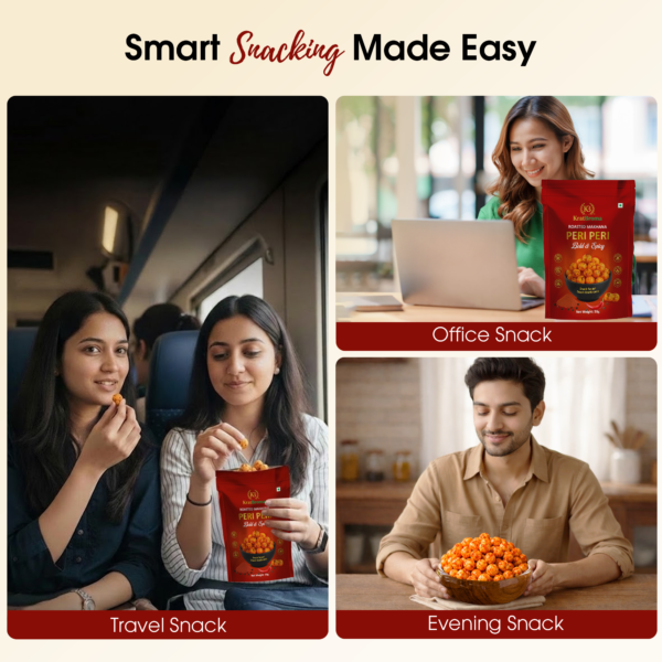 Turn up the heat with KratBroma Peri Peri Roasted Makhana (50g) — a bold & spicy snack crafted from premium lotus seeds. These makhanas are roasted, not fried, giving you a satisfying crunch without the heaviness of fried snacks.